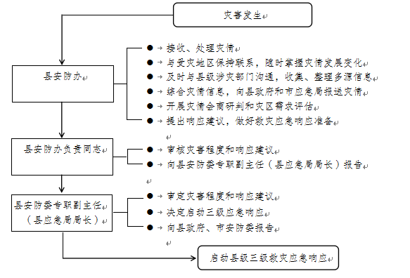 县应急管理部门按照应急管理部《自然灾害情况统计调查制度》《特别重大自然灾害损失统计调查制度》,做好灾情信息收集、汇总、分析、上报和部门间共享工作。