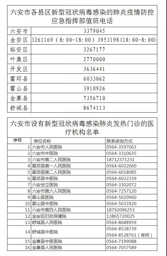 12月13日,六安市卫健委最新发布,市及各县区新型冠状病毒感染的肺炎疫情防控应急指挥部值班电话及设有新型冠状病毒感染肺炎发热门诊的医疗机构名单。