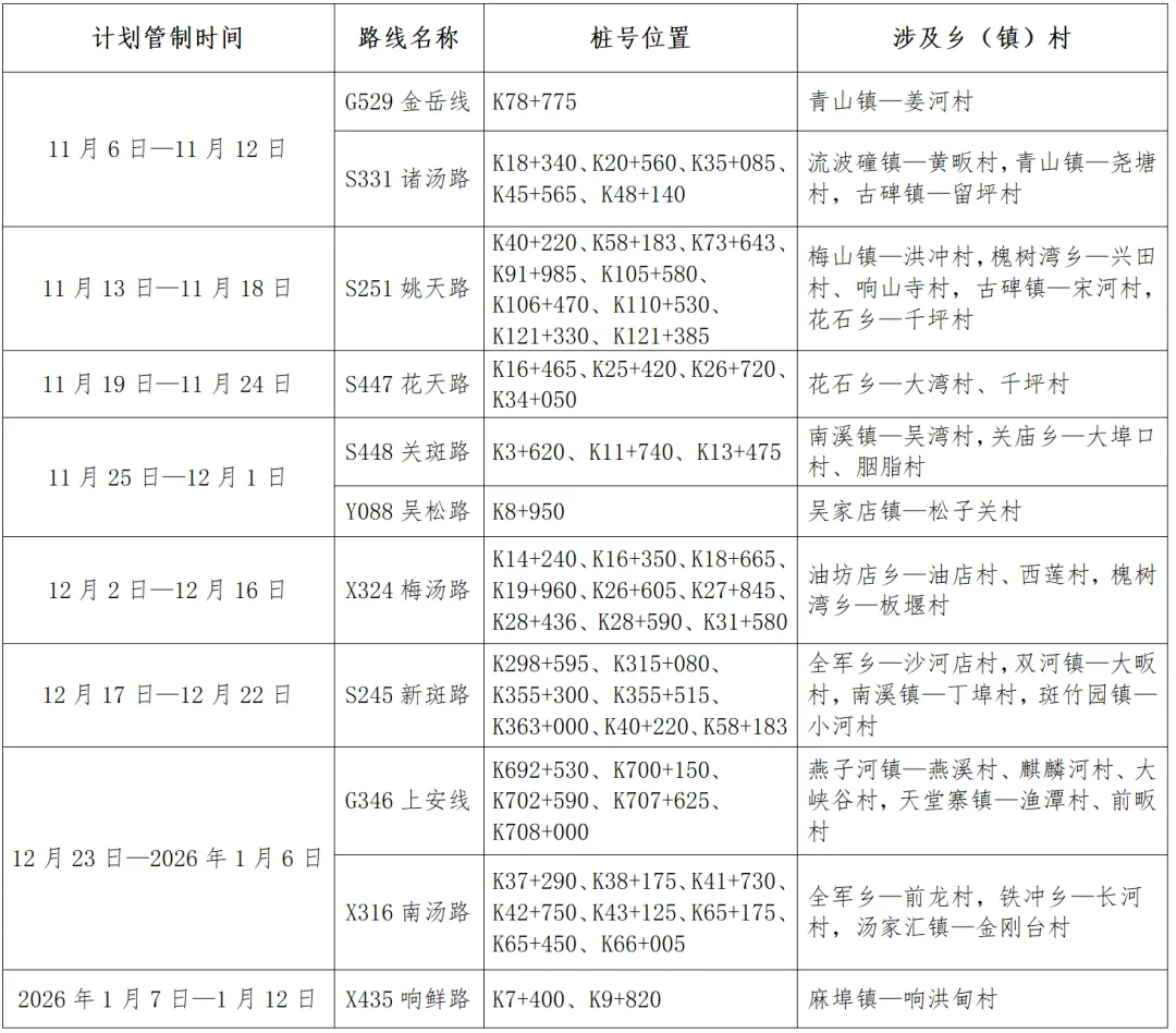 金寨县国省干线及骨干县乡公路风险隐患点治理项目已全部开工建设,施工需采取机械排除危石施工作业,为确保施工期间道路通行安全,决定对施工路段采取临时交通管制,间断放行。现公告如下:
