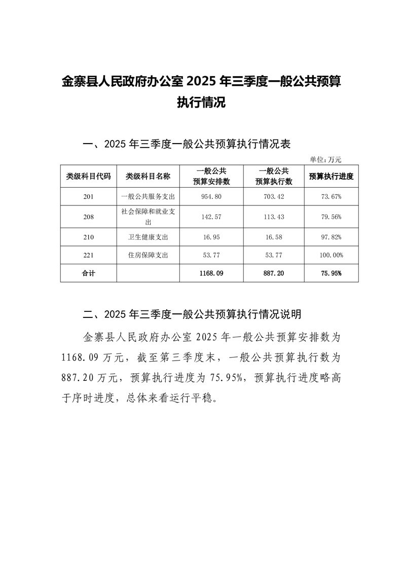 金寨县人民政府办公室2025年三季度一般公共预算执行情况