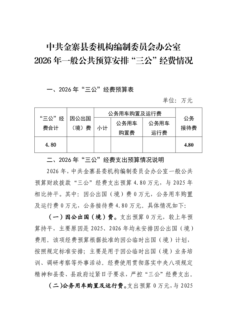 中共金寨县委机构编制委员会办公室2026 年一般公共预算安排“三公”经费情况