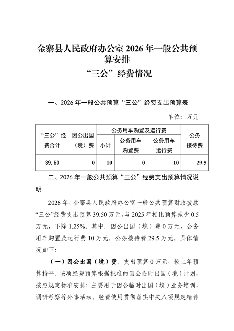金寨县人民政府办公室2026年一般公共预算安排“三公”经费情况