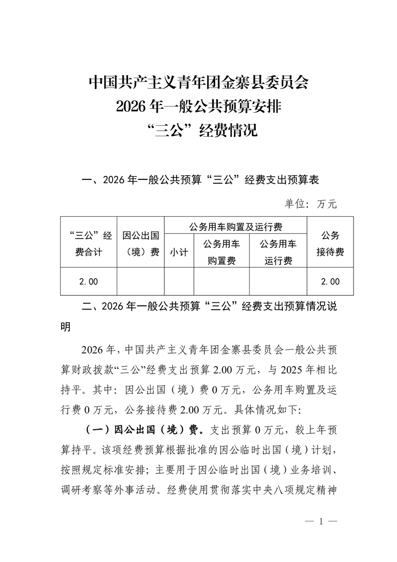 中国共产主义青年团金寨县委员会2026年一般公共预算安排“三公”经费情况公开