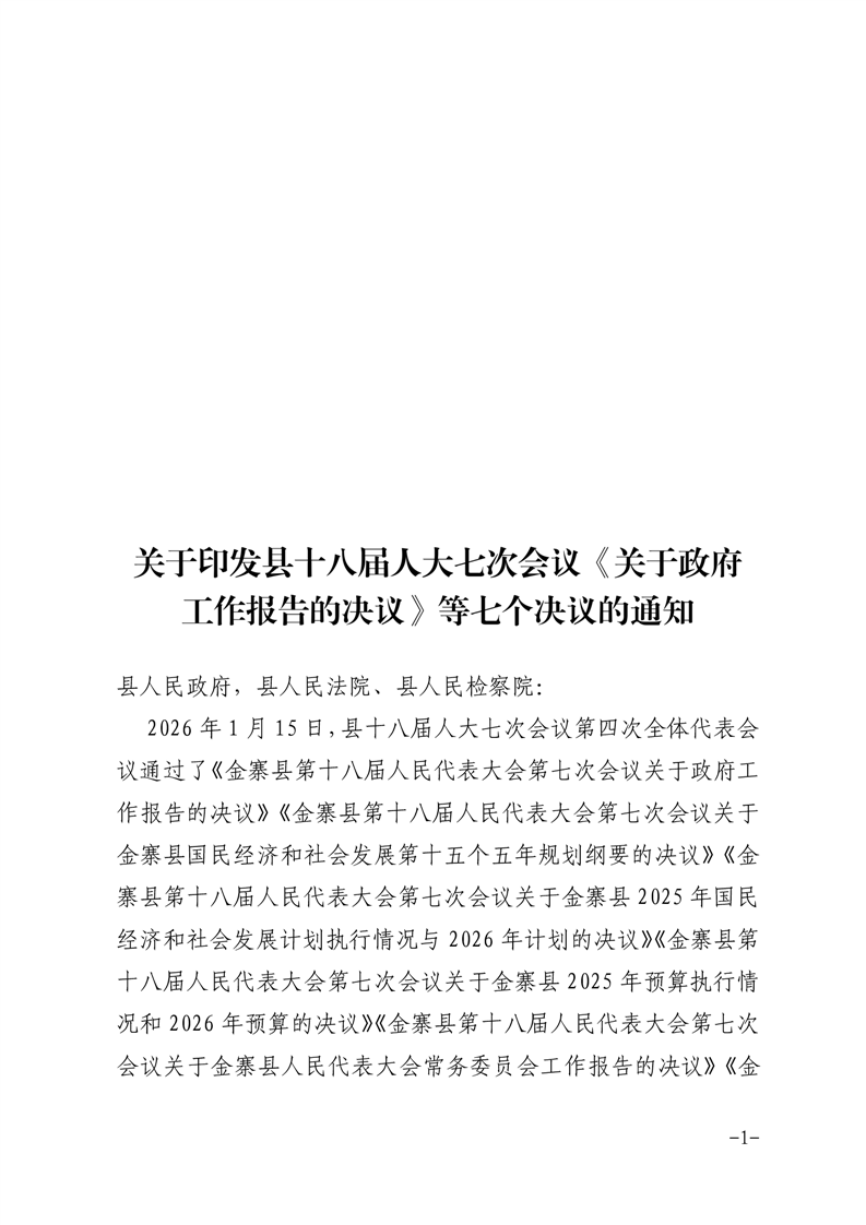 关于印发县十八届人大七次会议《关于政府工作报告的决议》等七个决议的通知