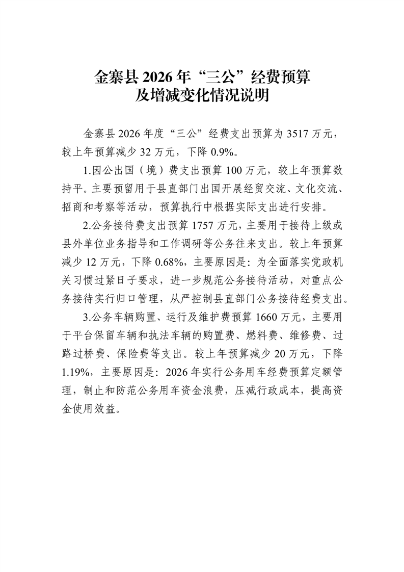 金寨县2026年“三公”经费预算及增减变化情况说明