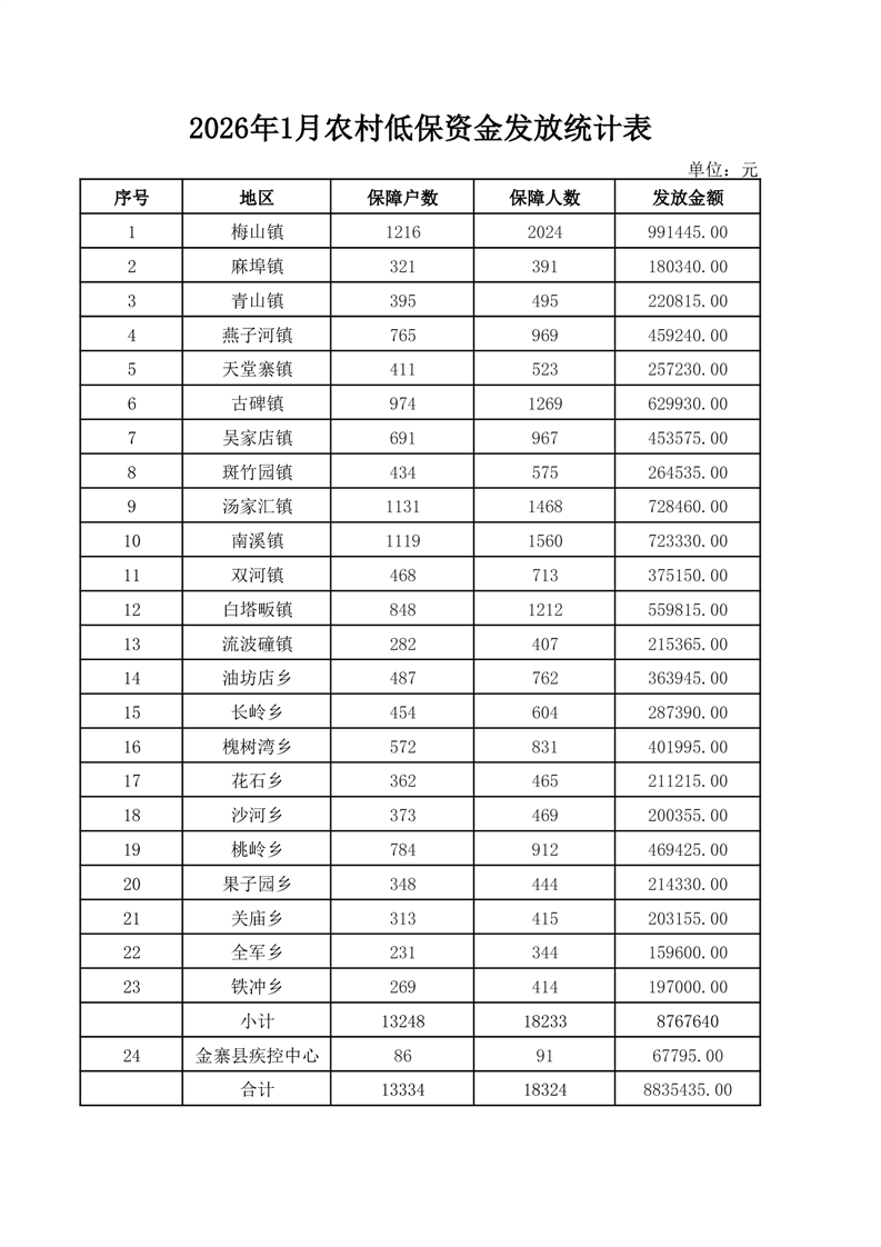 金寨县2026年1月农村低保资金发放统计表