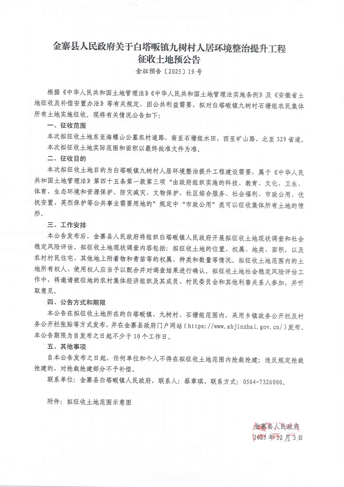 金寨县人民政府关于白塔畈镇九树村人居环境整治提升工程征收土地预公告(金征预告〔2025〕19号)