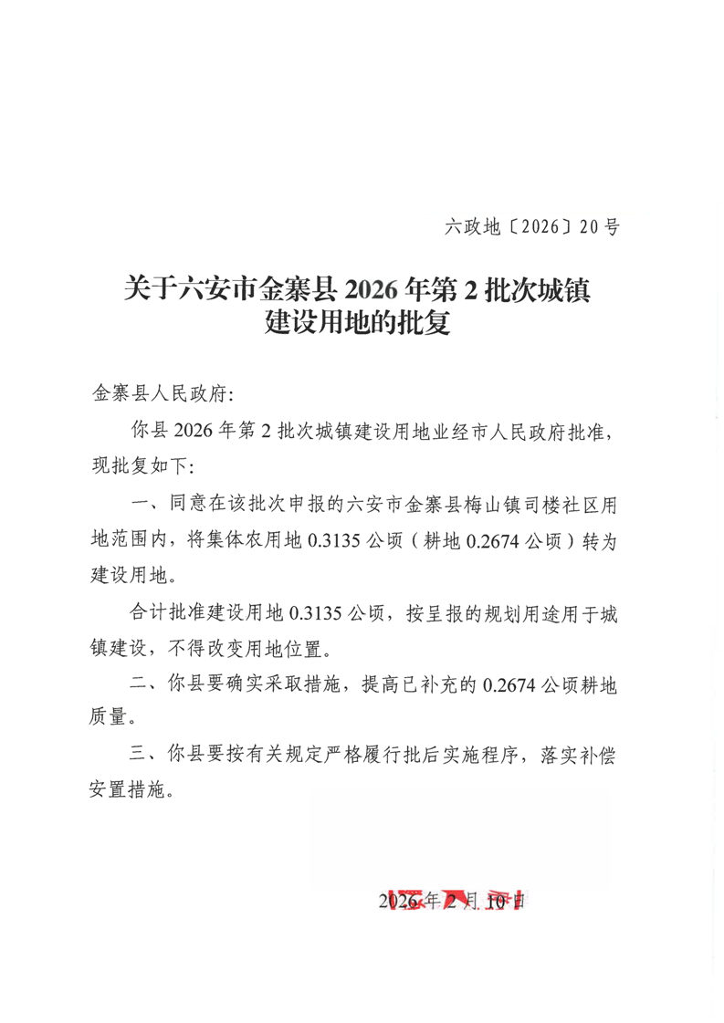关于六安市金寨县2026年第2批次城镇建设用地的批复