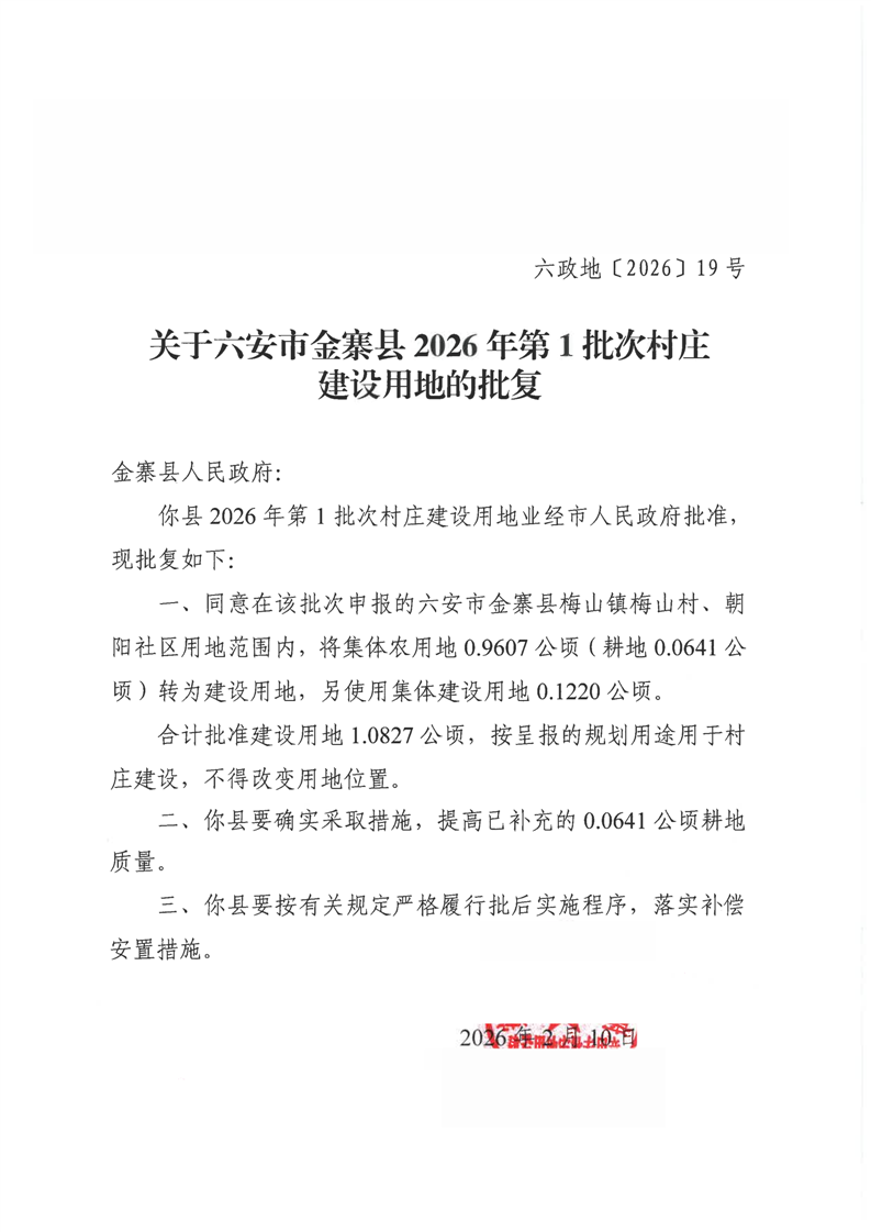 关于六安市金寨县2026年第1批次村庄建设用地的批复