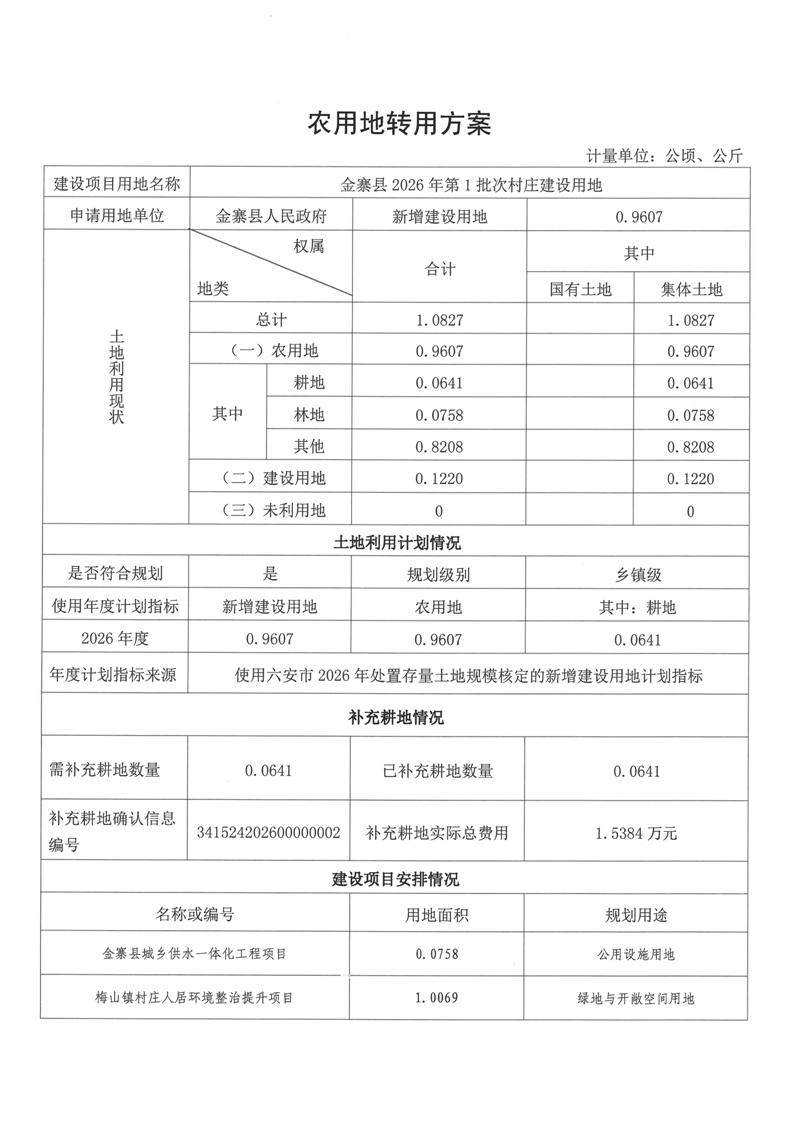 金寨县2026年第1批次村庄建设用地呈报农用地转用方案