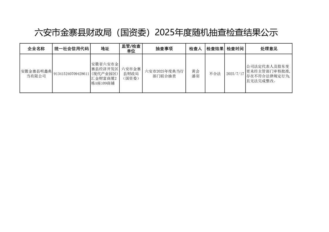 六安市金寨县财政局(国资委)2025年度随机抽查检查结果公示