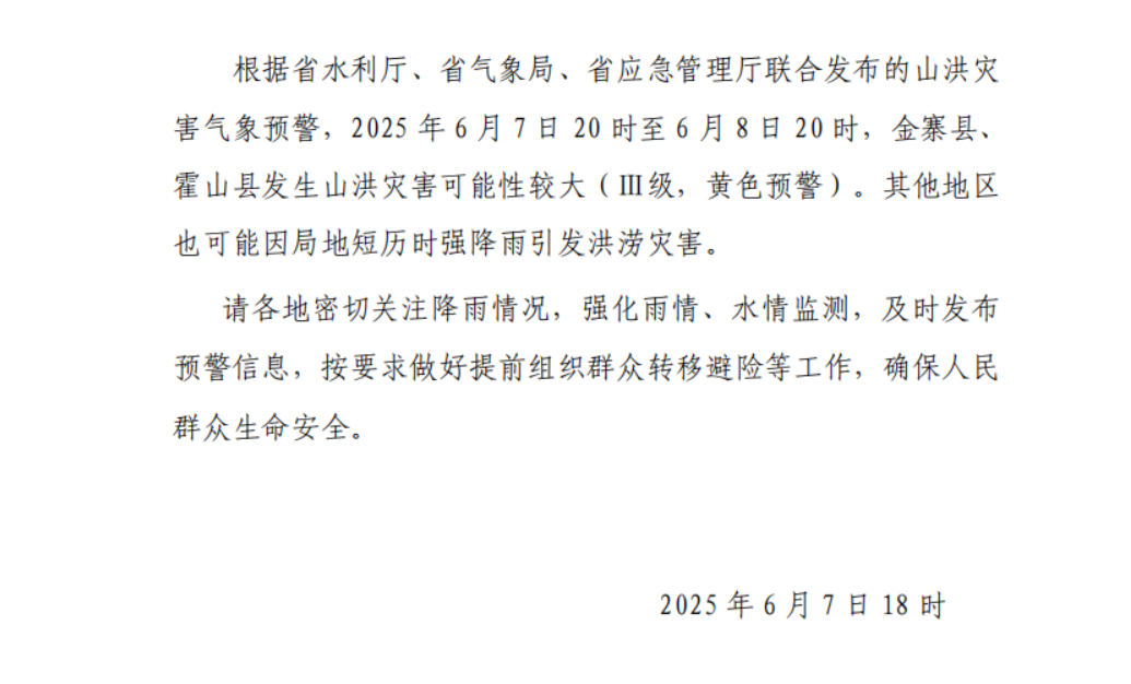 六安市水利局 六安市气象局 六安市应急管理局联合发布山洪灾害气象预警