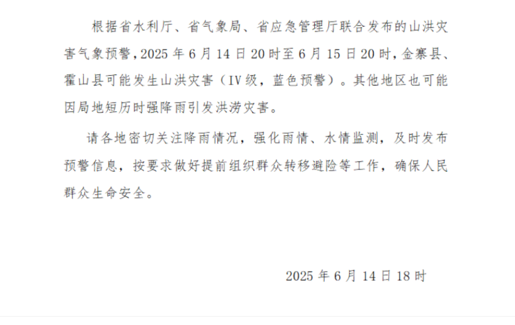 六安市水利局 六安市气象局 六安市应急管理局联合发布山洪灾害气象预警