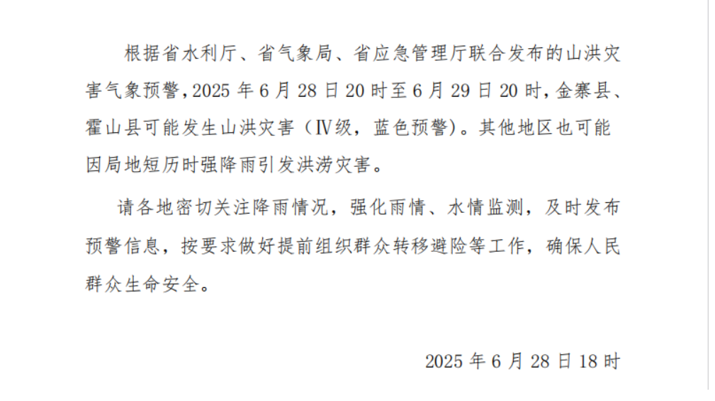 六安市水利局 六安市气象局 六安市应急管理局联合发布山洪灾害气象预警