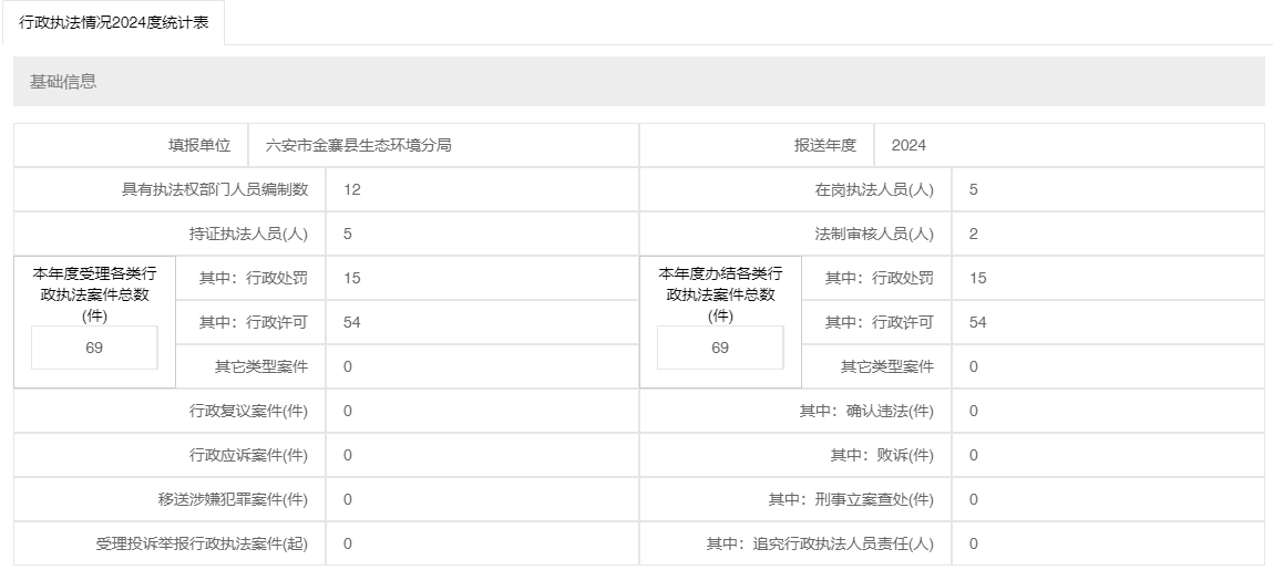 六安市金寨县生态环境分局2024年行政执法统计年报
