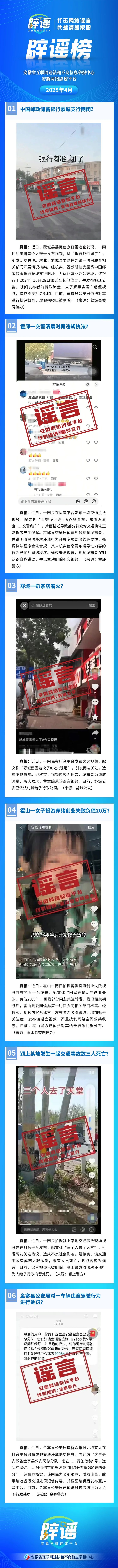 近期,省委网信办发布了安徽网络辟谣平台2025年4月辟谣榜,公布了6起辟谣典型案例,六安市《霍邱一交警清晨时段违规执法?》《舒城一奶茶店着火?》《霍山一女子投资养猪创业失败负债20万?》《金寨县公安局对一车辆违章驾驶行为进行处罚?》4起典型案例入选。
