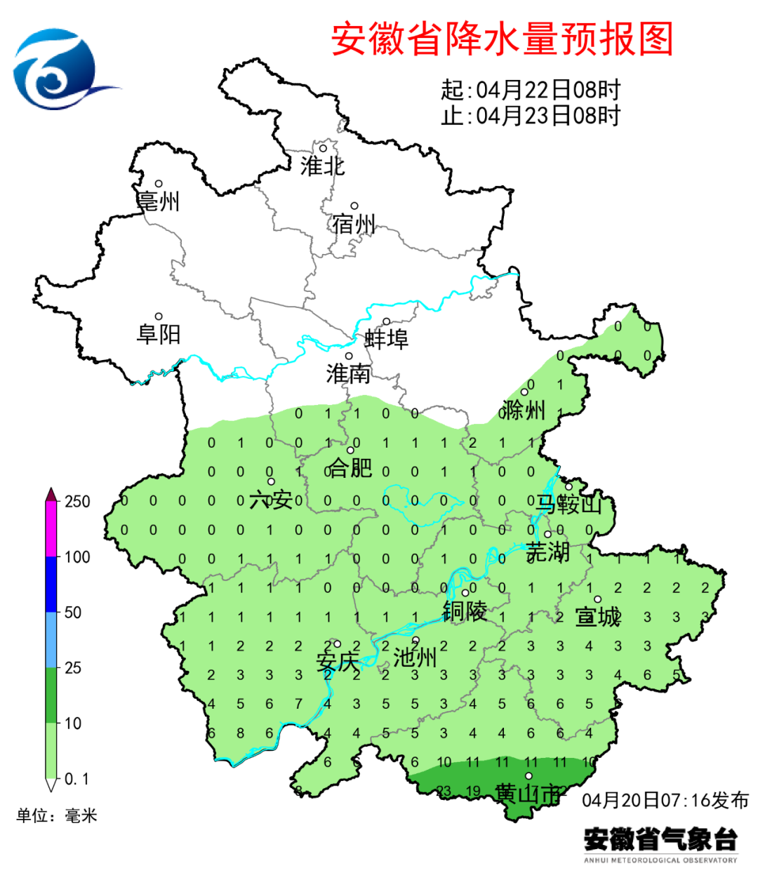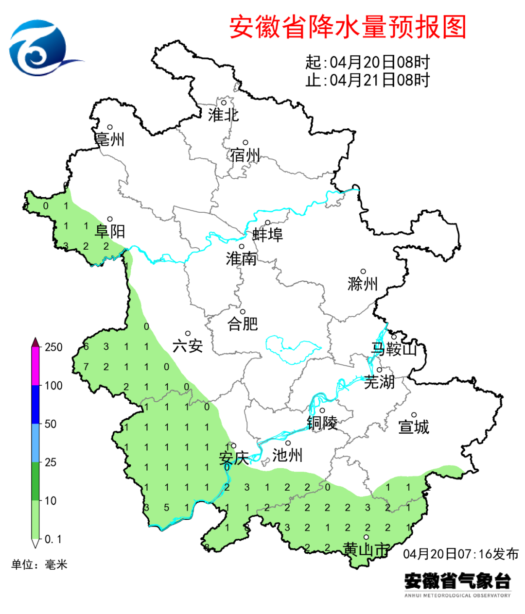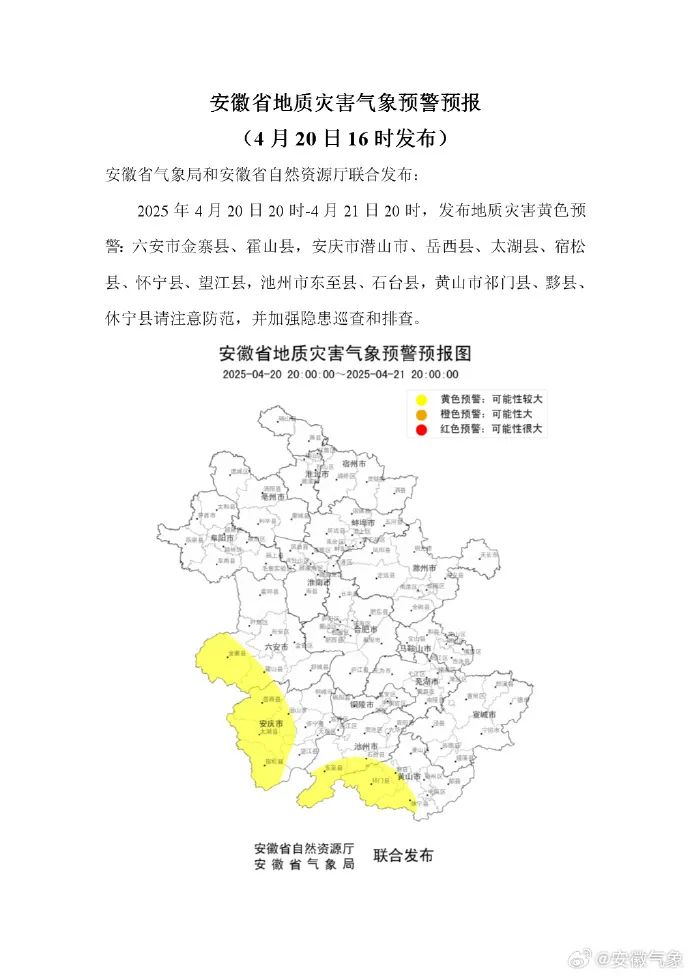 2025年4月20日20时-4月21日20时,发布地质灾害黄色预警:六安市金寨县、霍山县,安庆市潜山市、岳西县、太湖县、宿松县、怀宁县、望江县,池州市东至县、石台县,黄山市祁门县、黟县、休宁县请注意防范,并加强隐患巡查和排查。