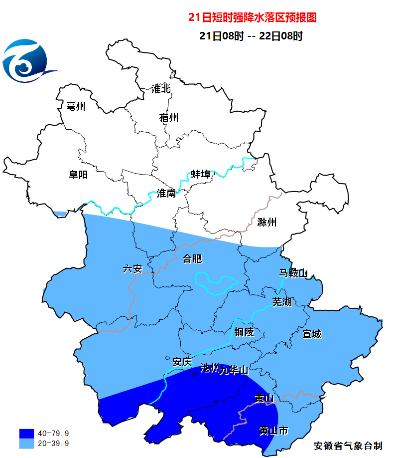 20日中午,气象部门发布预报,21日至22日全省有一次较强降水过程,淮河以南有中到大雨,其中大别山区和沿江江南部分地区(安庆、池州、铜陵、黄山、宣城市)暴雨,局部(安庆、池州、黄山市)大暴雨。降水主要发生在21日,强降水时段在21日午后至夜间。预计累计雨量:沿江江南60~80毫米,局地100~140毫米。22日降水减弱并自北向南渐止,其中江南南部中雨。23日至29日全省无大范围降水过程,其中26日至27日大别山区和沿江江南部分地区有阵雨或雷雨,其余时段全省以晴到多云天气为主。