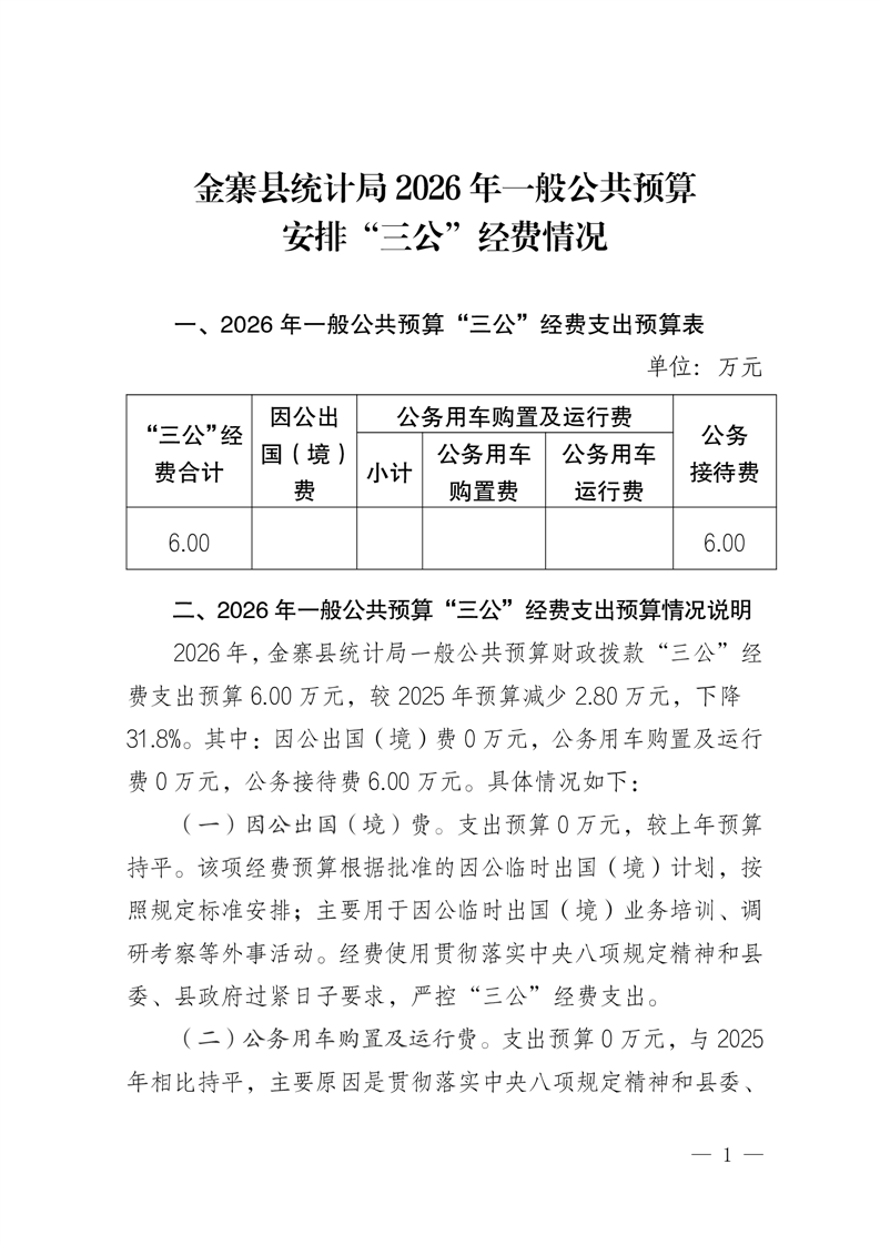 金寨县统计局2026年部门一般公共预算安排“三公”经费情况公开