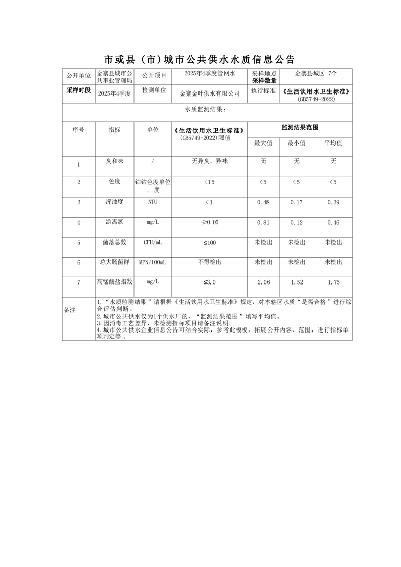 金叶供水2025年第四季度管网水7项