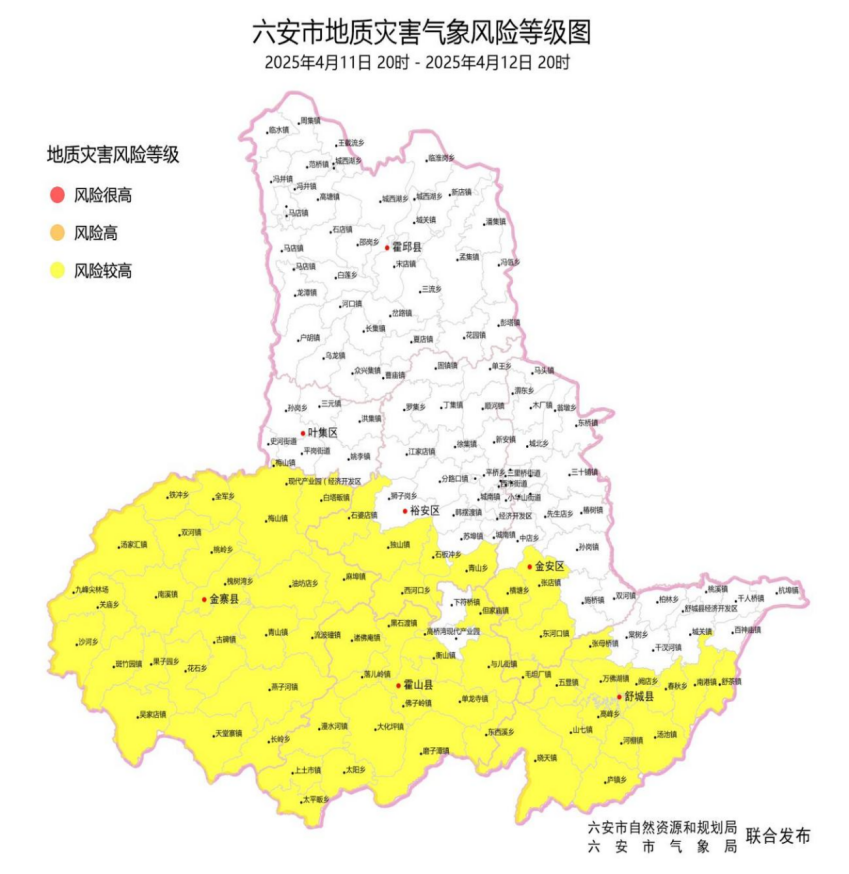 六安市自然资源和规划局、六安市气象局联合发布地质灾害气象风险预警:2025年4月11日20时至2025年4月12日20时,金安区(张店镇、毛坦厂镇、东河口镇、横塘岗乡),裕安区(独山镇、石婆店镇、青山乡、石板冲乡、西河口乡),舒城县(张母桥镇、南港镇、五显镇、万佛湖镇、阙店乡、春秋乡、舒茶镇、晓天镇、山七镇、高峰乡、河棚镇、汤池镇、庐镇乡),金寨县全境,霍山县(衡山镇、佛子岭镇、但家庙镇、与儿街镇、黑石渡镇、诸佛庵镇、落儿岭镇、磨子潭镇、大化坪镇、漫水河镇、上土市镇、单龙寺镇、东西溪乡、太平畈乡、太阳乡)发生地质灾害的可能性较大(Ⅲ级,黄色), 请密切关注本区域降雨情况,加强值班、监测、巡查。一旦发生地质灾害灾、险情,请立即做好应急处置工作,并按规定速报。