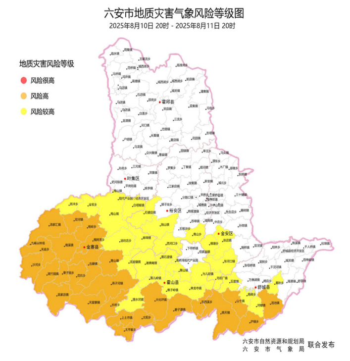 六安市自然资源和规划局、六安市气象局联合发布地质灾害气象风险预警:2025年8月10日20时至2025年8月11日20时,舒城县(晓天镇、山七镇、汤池镇、庐镇乡),金寨县(青山镇、燕子河镇、天堂寨镇、古碑镇、吴家店镇、斑竹园镇、汤家汇镇、南溪镇、双河镇、长岭乡、槐树湾乡、花石乡、沙河乡、桃岭乡、果子园乡、关庙乡),霍山县(磨子潭镇、大化坪镇、上土市镇、东西溪乡、太平畈乡、太阳乡)发生地质灾害的可能性大(Ⅱ级,橙色), 请以上地区密切关注降雨情况,加密对预警区域地质灾害隐患点和地质灾害危险区的巡查与监测频次,做好受威胁群众转移准备;加强值班和领导带班,24小时在岗在位,保持信息畅通;发生地质灾害灾情、险情,及时做好应急处置并立即上报;金安区(张店镇、毛坦厂镇、东河口镇、横塘岗乡),裕安区(独山镇、石婆店镇、青山乡、西河口乡),舒城县(五显镇、春秋乡、高峰乡、河棚镇),金寨县(梅山镇、麻埠镇、白塔畈镇、流波䃥镇、油坊店乡、全军乡、铁冲乡),霍山县(衡山镇、佛子岭镇、与儿街镇、黑石渡镇、诸佛庵镇、落儿岭镇、漫水河镇、单龙寺镇)发生地质灾害的可能性较大(Ⅲ级,黄色), 请密切关注本区域降雨情况,加强值班、监测、巡查。一旦发生地质灾害灾、险情,请立即做好应急处置工作,并按规定速报。