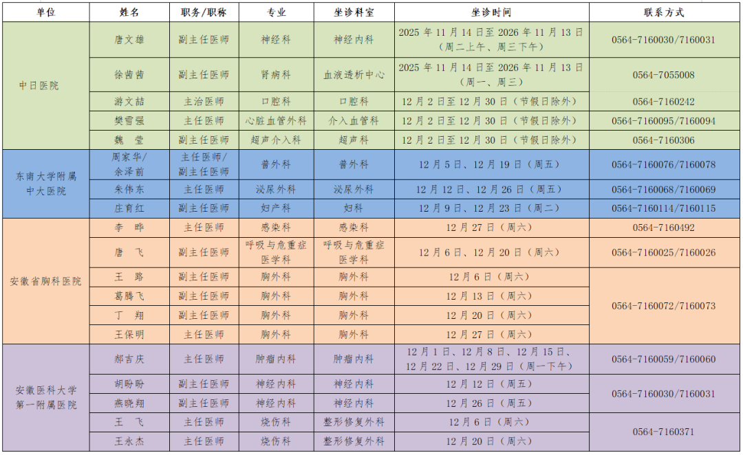 2025年12月,分别来自北京中日医院、东南大学附属中大医院、安徽省胸科医院、安徽医科大学第一附属医院的20名专家将在金寨县人民医院开展门诊坐诊及手术示教活动。学科涵盖神经内科、肾病学科、口腔科、介入血管科、超声科、普外科、泌尿外科、妇产科、感染科、呼吸与危重症医学科、胸外科、肿瘤内科、烧伤科等科室,有需要的患者可以前来咨询就诊。