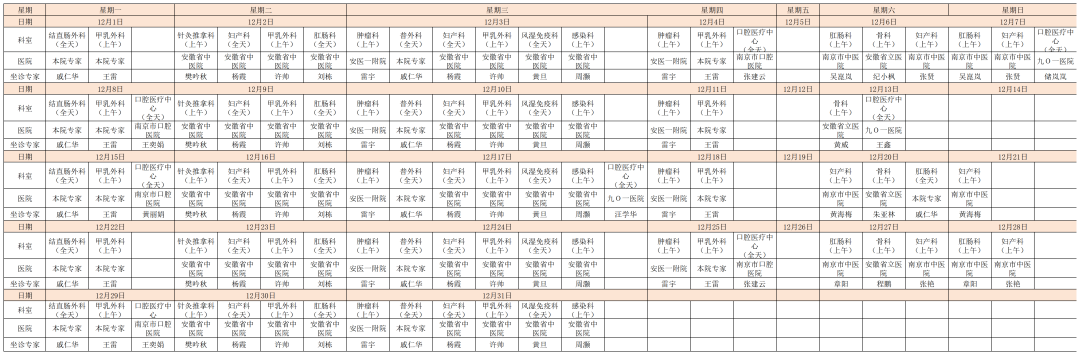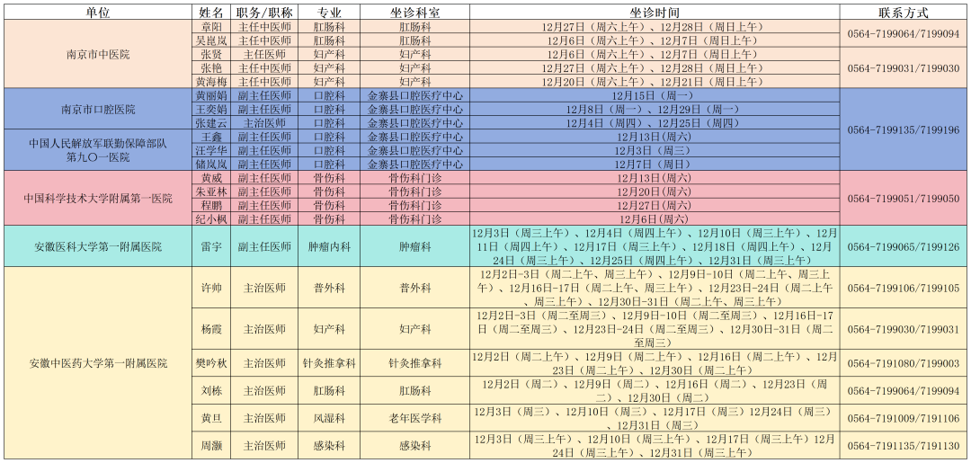 金寨县人民医院12月专家门诊坐诊明细