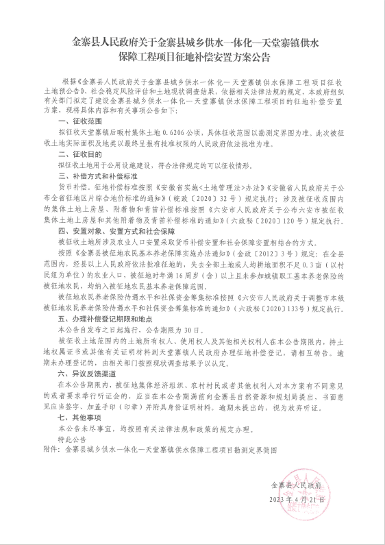 金寨县人民政府关于金寨县城乡供水一体化—天堂寨镇供水保障工程项目征地补偿安置方案公告
