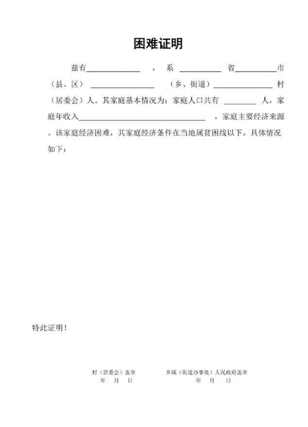 1.申请书、承诺书、家庭经济状况查询授权书。示例样表: