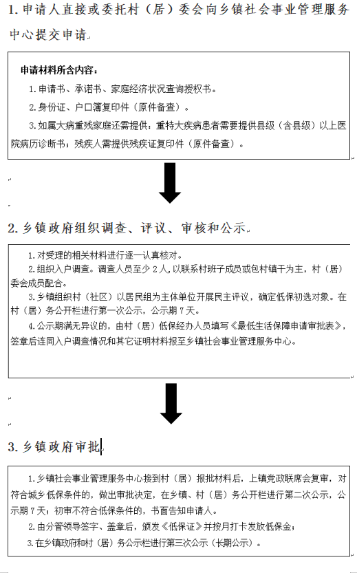 低保工作程序按照村(居)民委员会受理,乡镇民政业务经办部门初审,乡镇人民政府审核确认的程序实施。申请低保以家庭为单位,由申请家庭确定一名共同生活的家庭成员作为申请人,向户籍所在地或长期居住地的村(居)民委员会提出书面申请,也可以通过关注微信公众号“六安民政”、下载皖事通APP在“皖救一点通”模块进行线上申请。具体申请、确认程序按照《六安市最低生活保障工作暂行办法的通知》(六民办〔2021〕15号)规定执行。