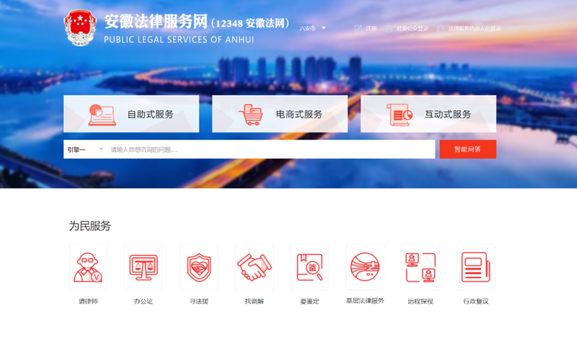 可通过安徽法律服务网(http://ah.12348.gov.cn/)进行法律咨询、申请办理法律服务事项。该网站设有法治地图、法律咨询、法律服务、普法学法等板块。其中,法治地图板块列(标)明了全省律师事务所、公证处、鉴定机构、法律援助机构、人民调解委员会等法律服务机构和人员的基本信息,供群众一键查找;法律咨询板块为群众提供法律问题和司法行政业务等咨询服务,群众只需简单注册即可获得;法律服务板块则为群众提供法律援助、公证、人民调解在线预申请等服务。