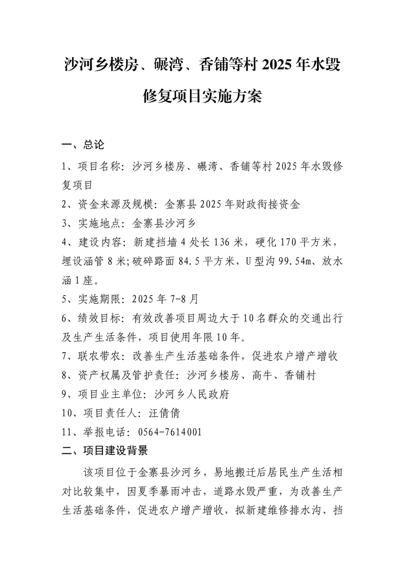 | 2 | 沙河乡楼房、碾湾、香铺等村2025年水毁修复项目 | 2025年7-8月 | 沙河乡人民政府 汪倩倩 |