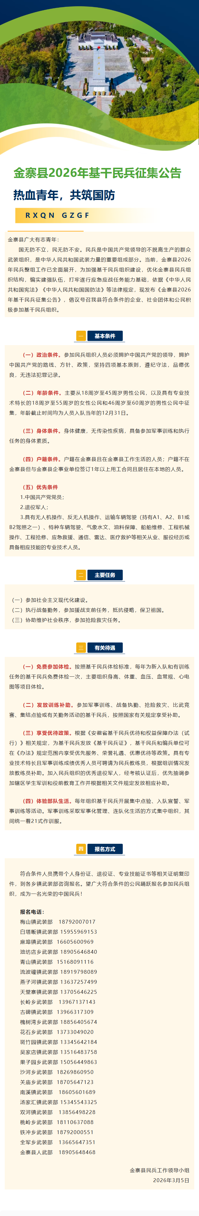 【征集公告】金寨县流波䃥镇转发:金寨县2026年基干民兵征集