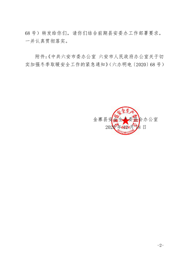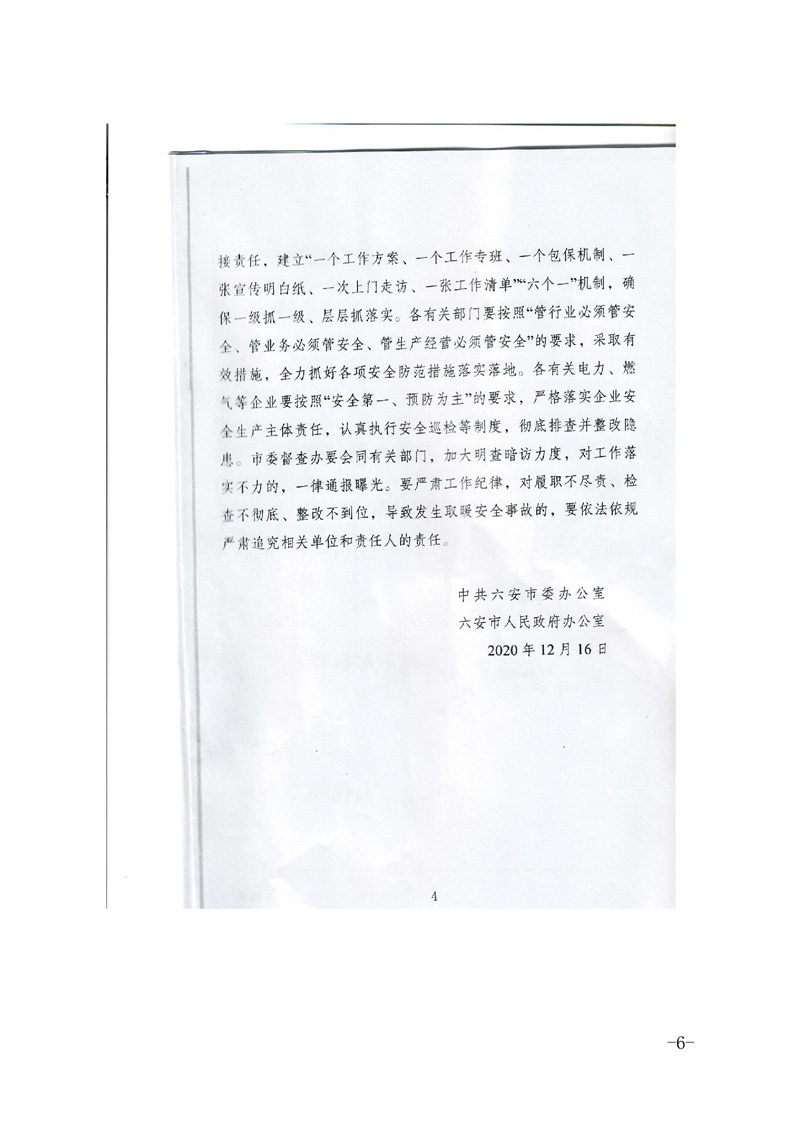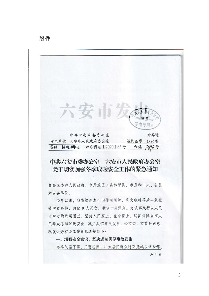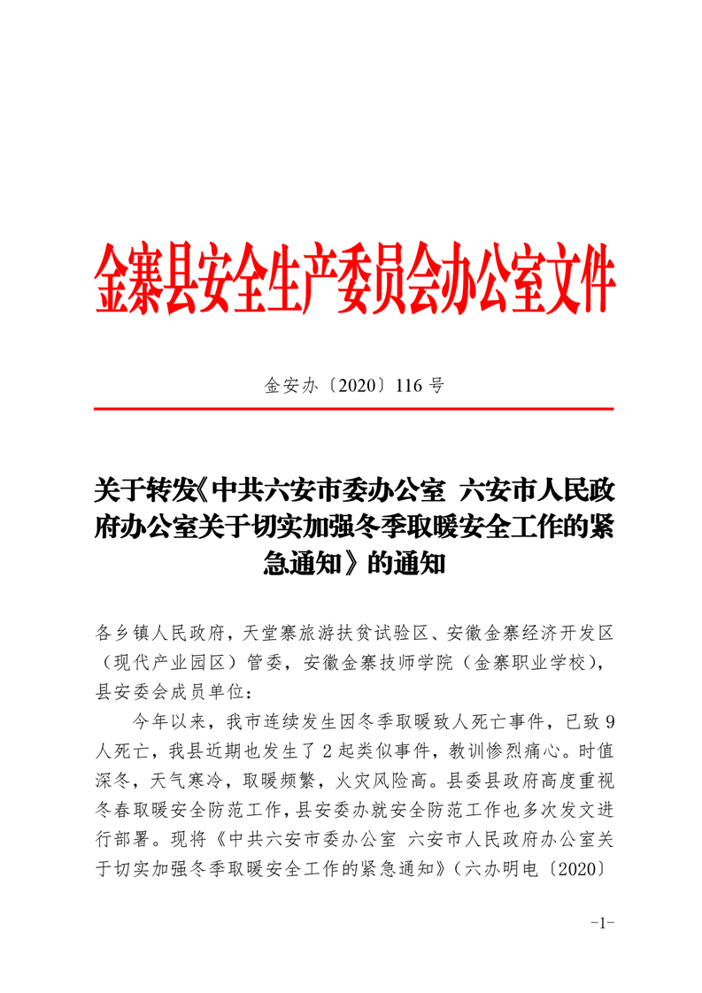 关于转发《中共六安市委办公室六安市人民政府办公室关于切实加强冬季取暖安全工作的紧急通知》的通知