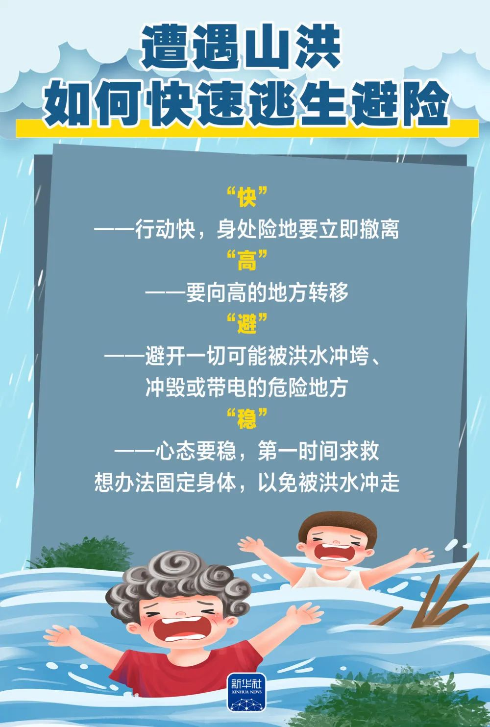 “稳”指的是心态要稳。第一时间求救,找坚固的地方固定身体,以免被洪水冲走。