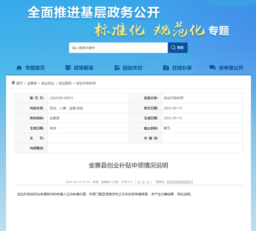 经与县级对接,截至目前,暂未收到创业补贴申请信息,下为县级发布信息,详情可点击链接跳转: