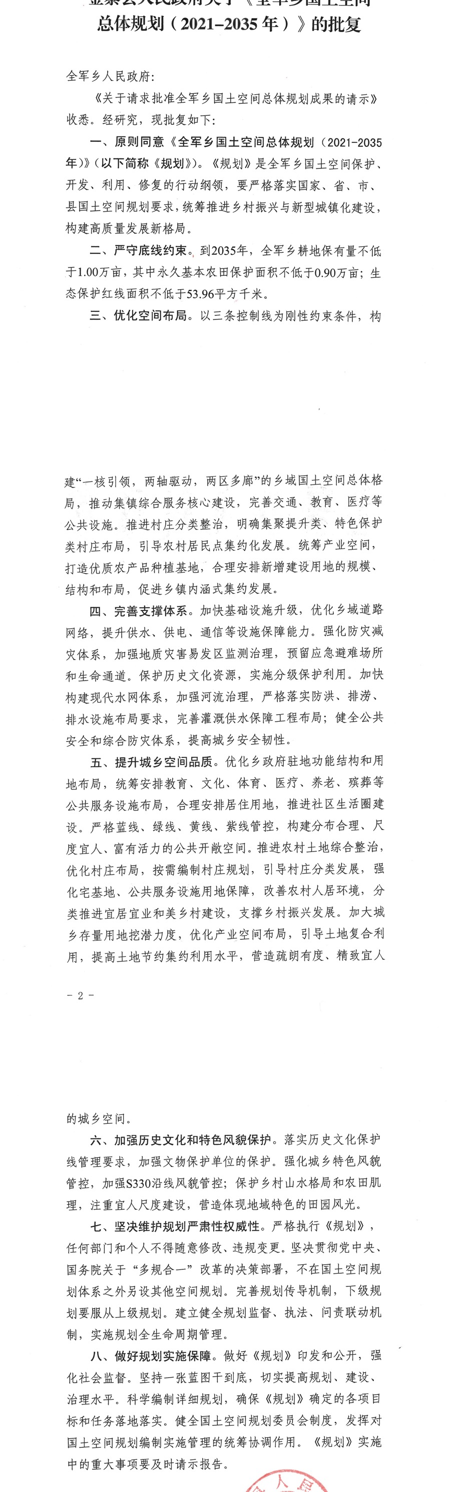 【批后公开】金寨县人民政府关于《金寨县全军乡国土空间总体规划(2021-2035年)》的批复