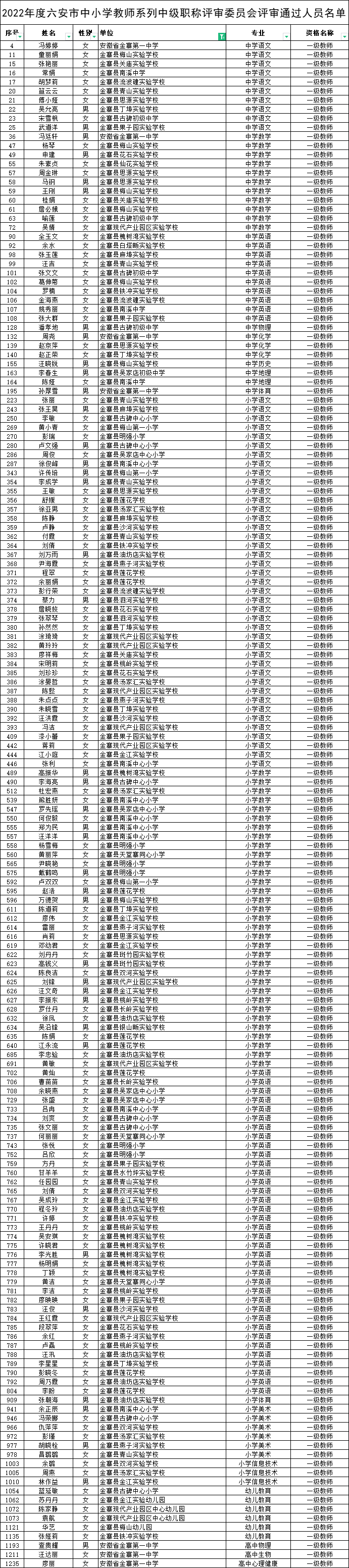 【评审结果】2022年度六安市中小学教师系列中级职称评审委员会评审通过人员公示(含燕子河镇)