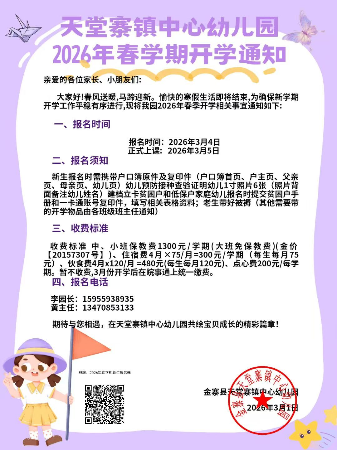 【招生方案】金寨县天堂寨镇2026年中心幼儿园春学期招生方案