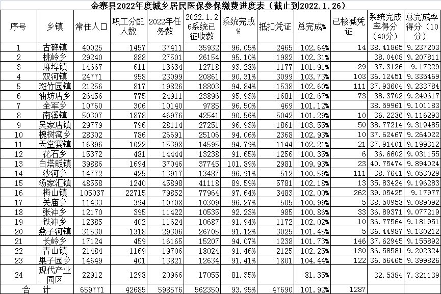金寨县2022年度1月份城乡居民医保参保缴费进度表(含麻埠镇)