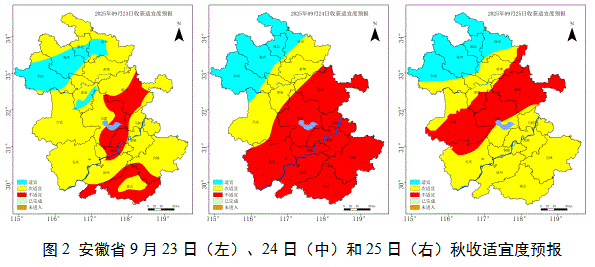 预计23-25日沿淮淮河以南有较明显降水过程,天气条件不利于一季稻等未成熟作物灌浆结实和已成熟作物的收获晾晒。预计未来三天秋收适宜性为:9月23日淮北中部适宜,江淮之间东部、皖南局部不适宜,其他大部分地区次适宜;24日淮北适宜,沿淮地区次适宜,其他大部分地区不适宜;25日淮北适宜,沿淮东部、江淮之间北部和大别山区不适宜,其他地区次适宜(图2)。