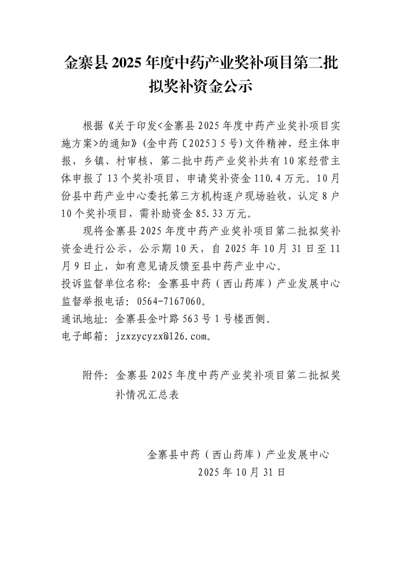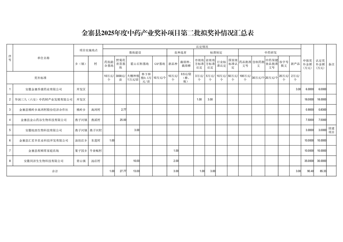 金寨县2025年度中药产业奖补项目第二批拟奖补资金公示