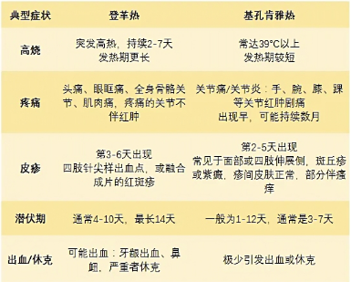 登革热病毒有四种血清型(DENV-1,2,3,4),感染一种血清型康复后,对该型有长期免疫力,但若再次感染其他血清型,发生重症风险反而增加;基孔肯雅热常伴有关节疼痛,与发热同时出现,可表现为多个关节和脊椎出现疼痛、关节肿胀,关节疼痛多为游走性,随运动加剧,晨起较重。急性期后,绝大多数患者的关节疼痛及僵硬状态可完全恢复。部分患者持续性关节疼痛和僵硬可达数周至数月,甚至3年以上。个别患者留有关节功能受损等后遗症。
