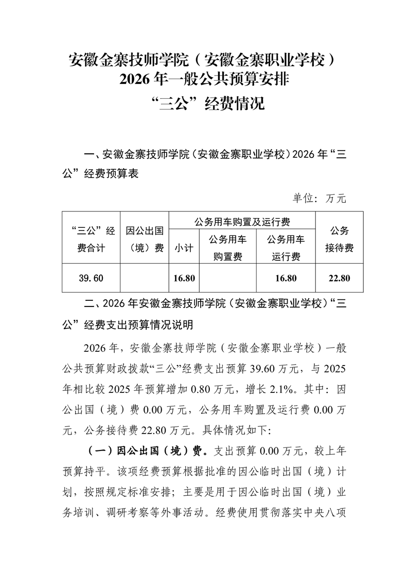 安徽金寨技师学院(安徽金寨职业学校)2026年部门单位一般公共预算安排“三公”经费情况 |