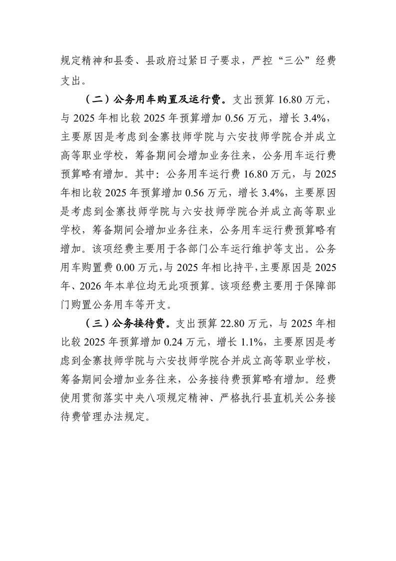 安徽金寨技师学院(安徽金寨职业学校)2026年部门单位一般公共预算安排“三公”经费情况