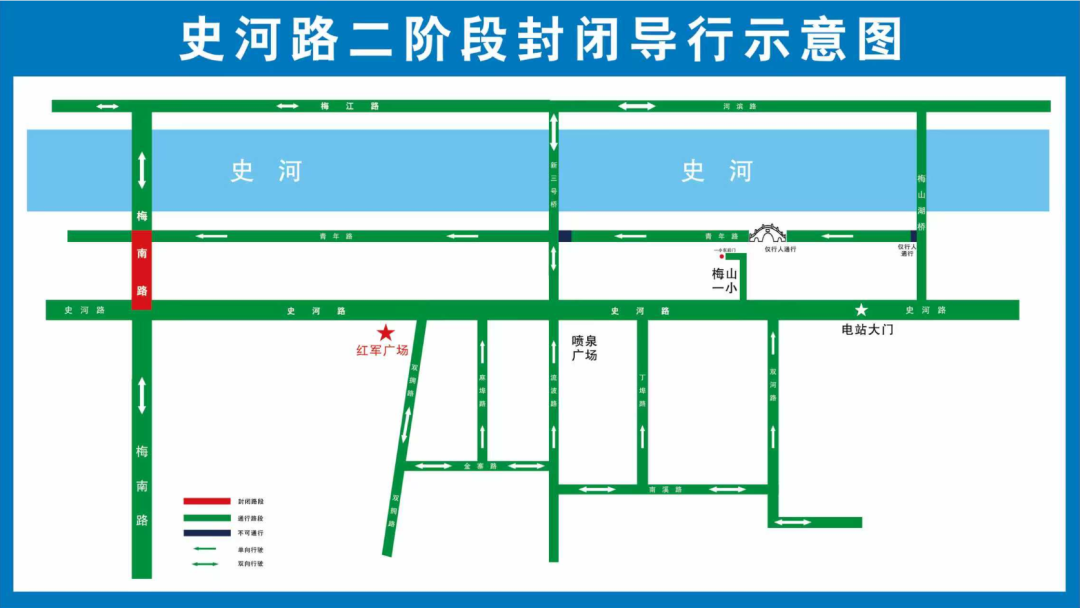 因梅南路提升改造施工需要,经批准,对梅南路(红绿灯至四号桥段)进行道路全封闭施工,请过往车辆、行人减速慢行,给您带来的不便敬请谅解。