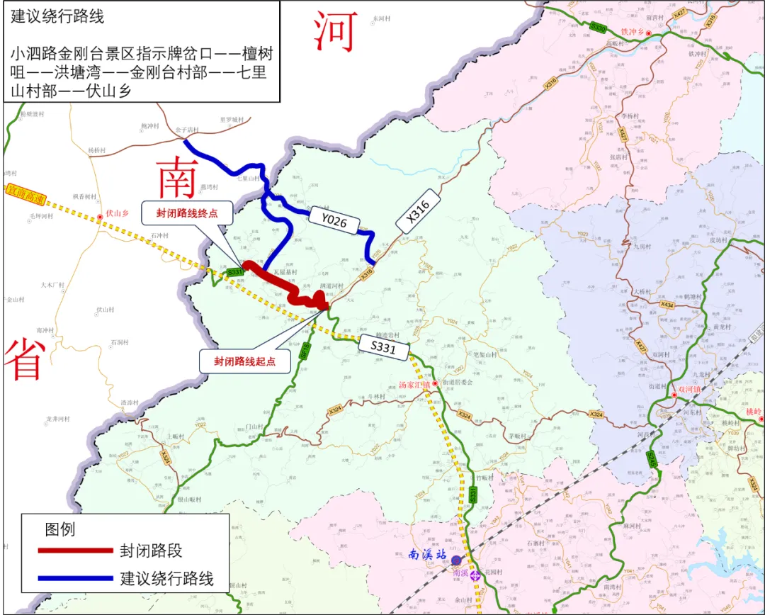 道路施工期间,建议过往小型车辆选择从小泗路金刚台景区指示牌岔口—金刚台村部—七里山村部—伏山乡绕行或自行选择安全路线合理绕行。