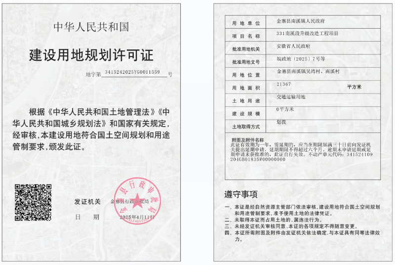 331南溪段升级改造工程项目-金寨县用地规划许可证