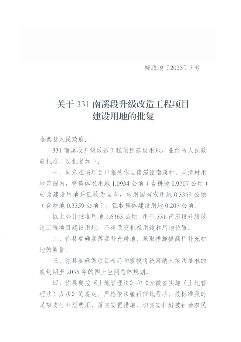关于331南溪段升级改造工程项目建设用地的批复